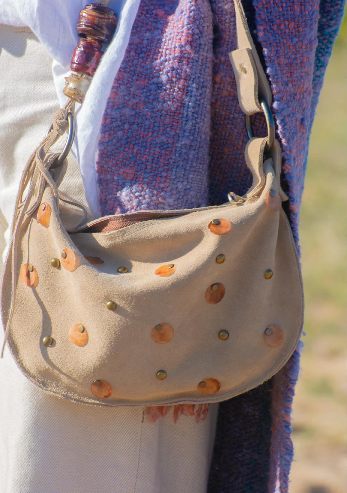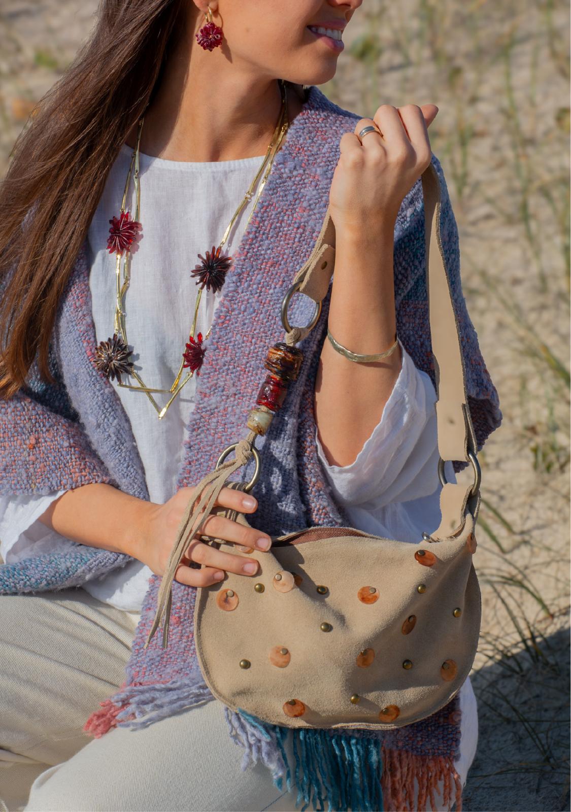 Cartera en cuero con detalles en plástico PET reciclado: lentejuelas en parte delantera y perlones en el asa